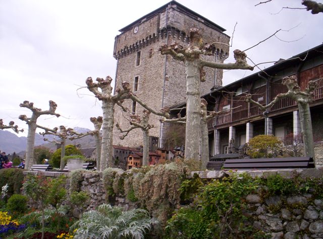 This view of the terrace at the Chateau Fort with the Pyrenees peering above the trees at the end
